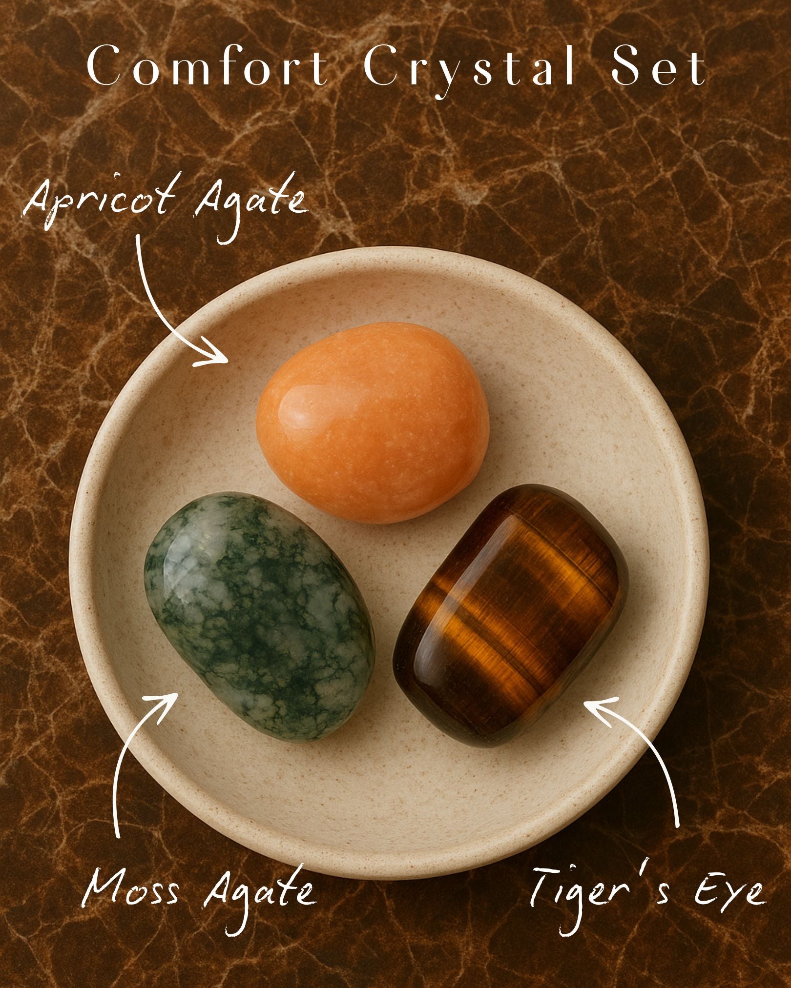 includes grounding apricot agate, renewing tiger's eye, and moss agate to feel connected to nature. *Automatically added to cart on qualifying orders while supplies last*