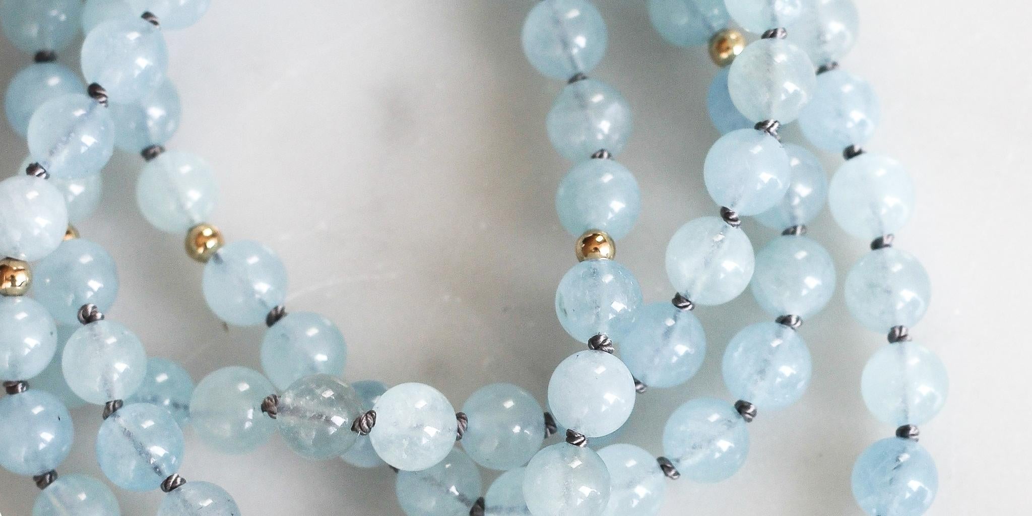 The Tranquility Pendant Mala Necklace is hand-knotted with round, Aquamarine gemstones. Known as the ‘stone of the sea’, tranquil aquamarine keeps the ocean close to your heart.