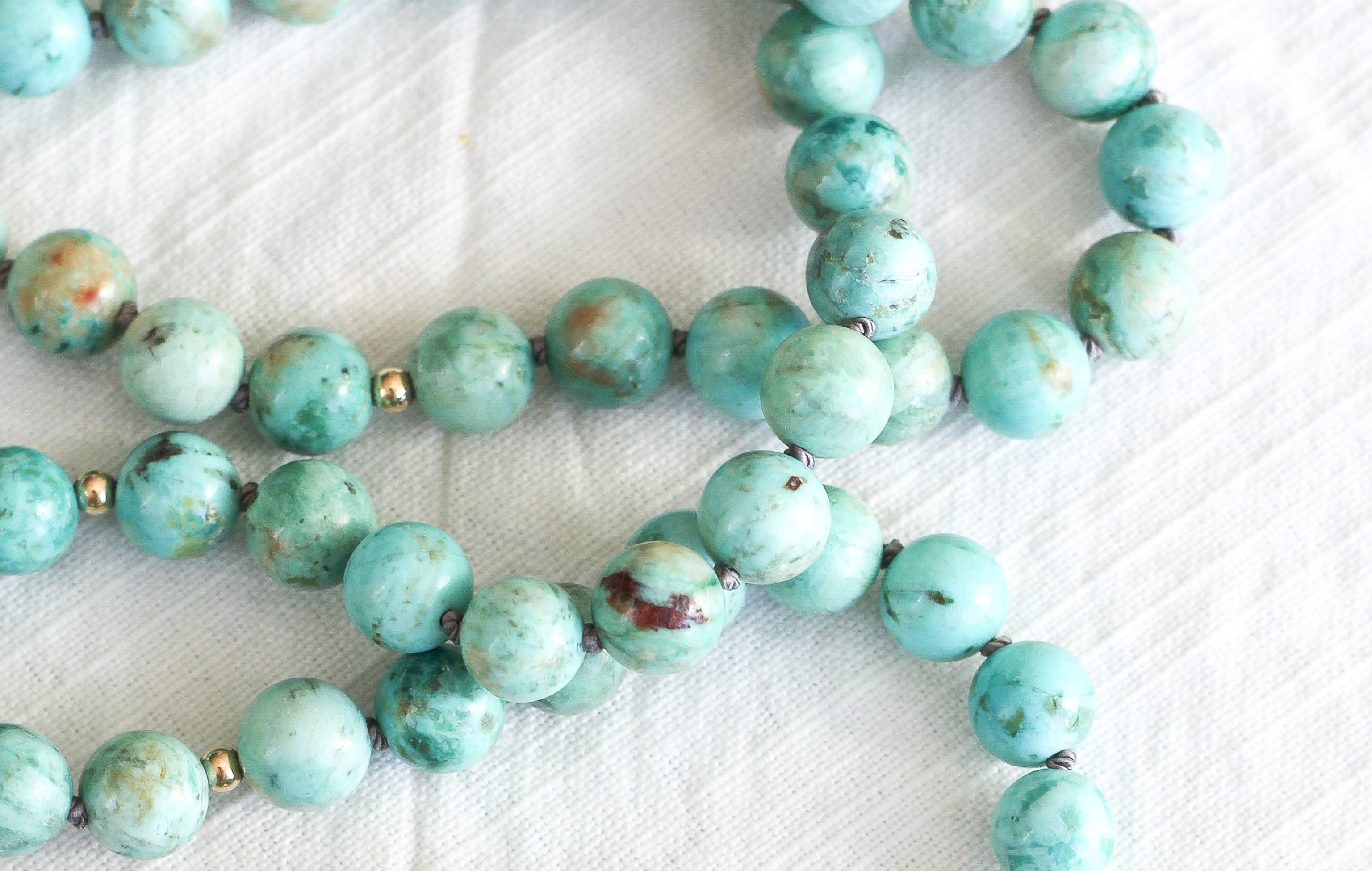 The Turquoise Mala Bracelet is hand-knotted with beautiful Peruvian Turquoise gemstones. Shimmering in shades of blue, Turquoise calms the soul - reminding us of the flow of water and the cleansing energy of the Earth.